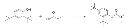 Add dichloromethane to a dry reaction vessel, followed by 2,4-di-tert-butylphenol, and stir until the substrate is completely dissolved. Then, add 4-dimethylaminopyridine and triethylamine, stir and mix well, and introduce an inert gas to replace the air in the system, maintaining an inert atmosphere for protection. Slowly add methyl chloroformate to the reaction system through a constant pressure dropping funnel (control the temperature not to exceed 5℃ during the addition). After the addition is complete, allow the temperature to naturally rise to room temperature, and keep stirring overnight.